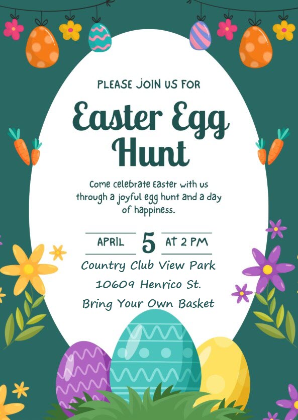 UPDATE: Happy Easter! Come to the Easter Egg Hunt in the Country Club View Park on Sunday, April 5, at 2:30 pm.